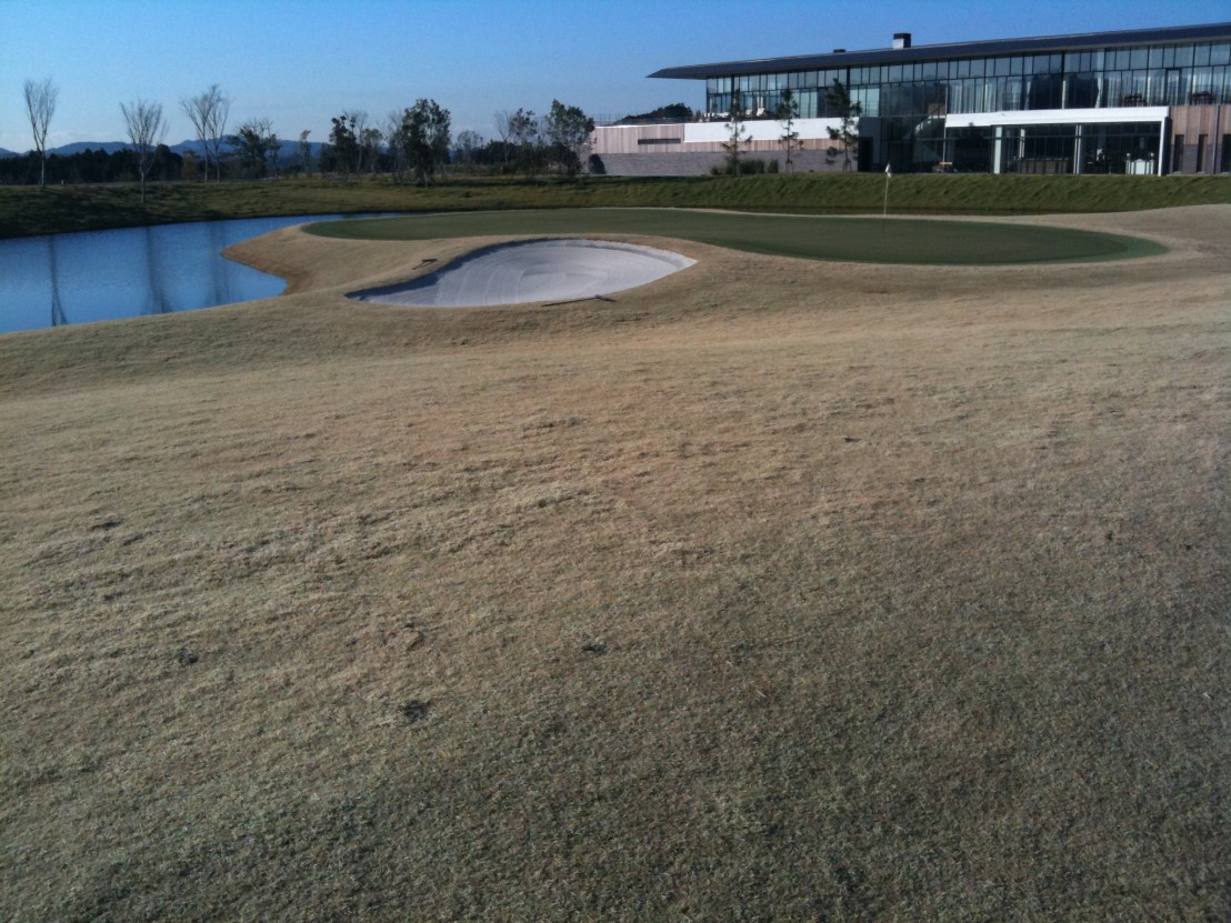 今年のゴルフ初めは「富津ブリストルヒル・ゴルフ&レジデンス」。入り口の大きなゲートをくぐると、広々としたコースが広がっている。「ゴルフ場に住む贅沢」をコンセプトにゲーテッド・ゴルフコミュニティがつくられている。キャディはおらず、セルフでGPSつき二人乗りカートをコースに乗り入れて、スルーで楽しめる。コースはかなり難しい。