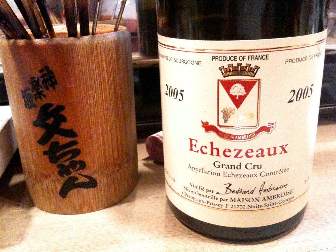 焼き鳥「文ちゃん」にて、エシェゾーを飲む。Echezeaux Domaine Bertrand Ambroise 2005。ベルトラン・アンブロワーズは、ブルゴーニュでありながら非常にタンニンのしっかりしたフルボディのワインをつくる。このエシェゾーも、どっしりとしており、鴨にとてもよくあう。