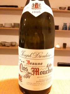 Beaune Clos de Mouches Blanc Domeine Jseph Drouhin 2006 @かんだにて。ちょっと珍しいジョゼフ・ドルーアンの白。ムーシュとは蜂の意味。昔、養蜂家がこの地域にいた名残りとのこと。2006年なのに充分な熟成感があり、しっかりした味わい。