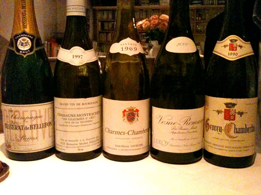 Nの誕生日記念で、Y家にワインバー「エスペランス」に招待して頂いた。Besserat de bellefon(ベスラ・ド・ベルフォン)。シャンパン古酒の繊細な泡と、柔らかい密のような味わい。Chassagne-Montrachet Les Chaumees Clos de la Truffiere Domaine Michel Niellon1997(シャサーニュ・モンラッシェ・ドメーヌ・ミッシェル・ニーロン)時間とともに、硬質な印象から芳醇で力強い白に変貌する様が凄い。ミッシェル・ニーロンは、ラモネと並び称される作り手とのこと。Charmes-Chambertin Domaine Jean-Pierre JAVELIER 1969(シャルム・シャンベルタン・ドメーヌ・ジャン・ピエール)40年の歳月を感じさせない、色彩、力強さ、そして繊細で複雑な奥行き。脱帽です。Vosne-Romanee Domaine Leroy 2000(ヴォーヌ・ロマネ・ドメーヌ・ルロワ)時間とともに圧倒的な魅力を放つ最高のできです。Gevrey-Chambertin Domaine Armand Rousseau 1990(ジュブレイ・シャンベルタン・ドメーヌ・アルマン・ルソー)。締めの一本。もう文句無しです。