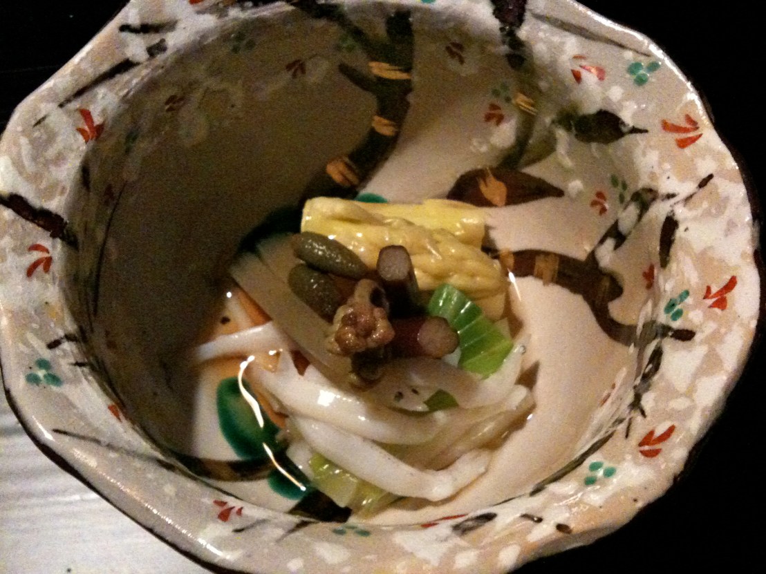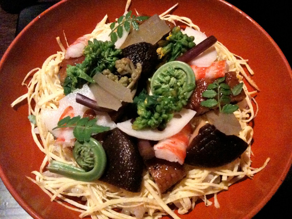 嘉助にて「三十五種類の春野菜」というコースを頂いた。素材の種類が本当に凄い。一品一品の味付けも我々の好みに合っていた。白魚、うるい、わらび、ふき、白アスパラガス、土筆、椎茸、独活、白菜、いんげん、人参、もやし、水菜、三つ葉、信州サーモン、本鮪、さより、芽ふき野菜、くみ上げ湯葉、うすい豆、百合根、甘鯛、車エビ、生姜、鰆木の芽焼き、あまご、たらの芽、こしあぶら、こごみ、よもぎ、にわとこ、信州牛ロース小鍋、グリーンアスパラ、山独活、椎茸、葱、焼き豆腐、、春堀長芋、春椎茸、菜の花、人参、穴子やわらか煮、春菜すし、山菜、海老、鰻、干し椎茸、季節の果物(イチゴ、キウイ)、嘉助特製抹茶アイスクリーム入りお善哉・・。大満足でお腹もいっぱいに。