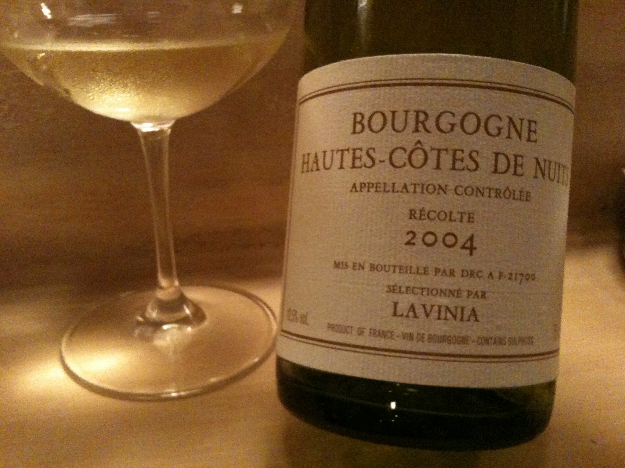 天ぷら「楽亭」にて、Bourgogne Hautes-Cotes de Nuits LAVINIA 2004という広域の白ワインを飲んだ。サンヴィヴァンの修道院の畑でつくられ、DRCで瓶詰めされている。酸味/樽香が魅力的で、ほろ苦いような香ばしさを感じさせる。天ぷらによく合いました。安ければネットで買い!!