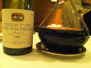 ヴォルネイ・クロ・ドーディニャック1985年。ドメーヌ・ラ・プスドール。85年ものだが、まだレンガ色ほど枯れていない。艶っぽさが出ており丁度飲み頃。酸味が魅力的。