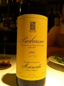 エノテカドォーロにて。バルバレスコ・マイネルドDOCG(1998 Vitivinicola Mainerdo DOCG Barbaresco)。ネッビオーロ100%、よいヴィンテージで、飲み口はやさしくタンニンも抑制されていて、やわらかい甘みが魅力。ミディアムボディ。パスタ(ロッソ)にとてもよくあいます。