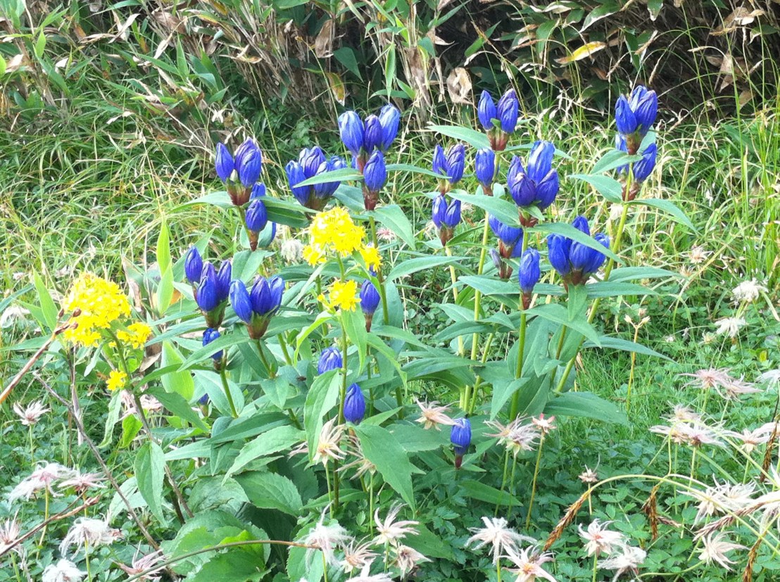 草花は、チングルマは盛りを終え(画面下綿毛)、ミヤマアキノキリンソウ(黄色い花)とエゾオヤマノリンドウ(青い花)が最盛期を迎え、赤とんぼが乱れ飛んでいた。