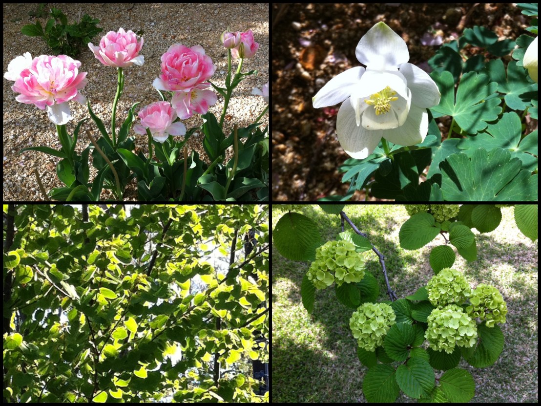 チューリップ・アンジェリケは、満開(左上)、オダマキ・フレグランス(右上)は、いくつか花が出てきた。桂の葉は美しく萌え(左下)、大手毬(右下)は来週当たりには白い花をつけそうだ。