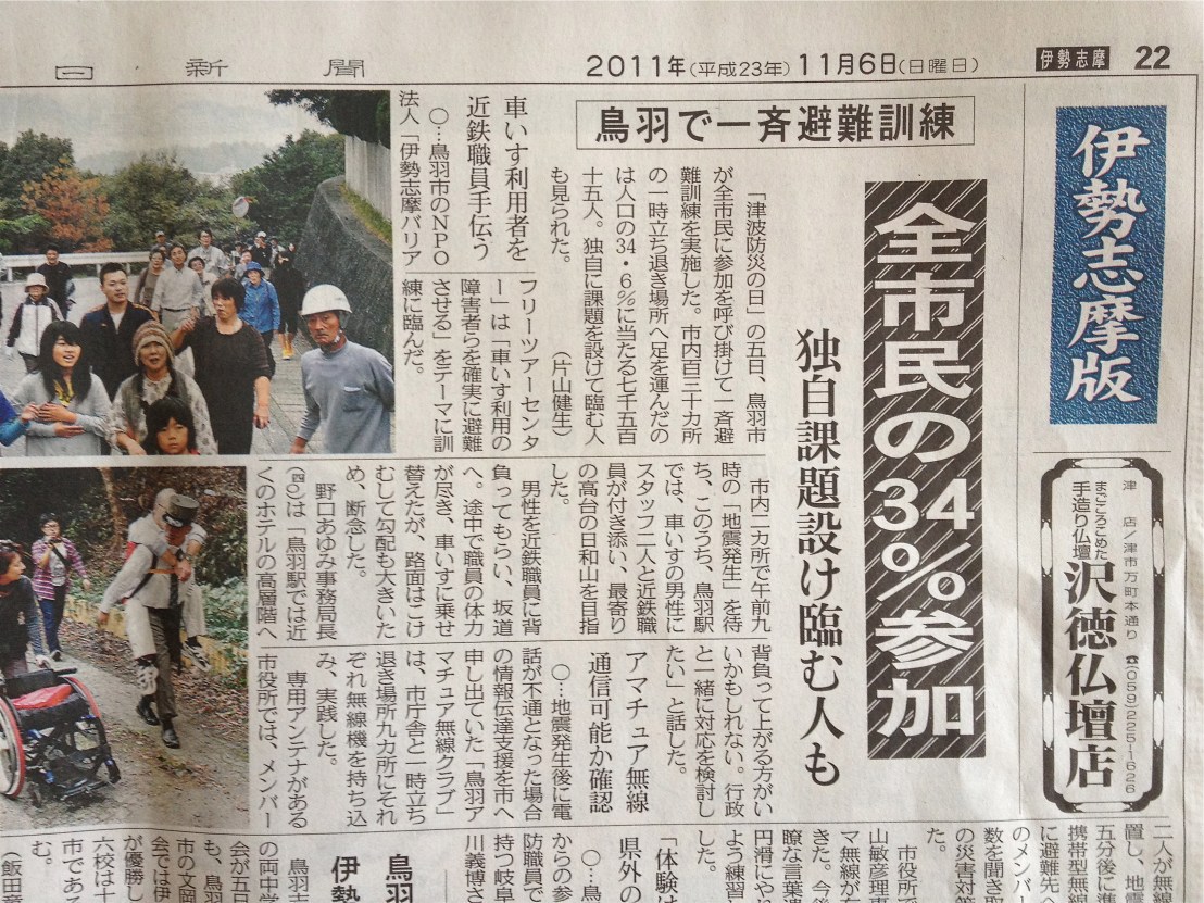 津波防災の日 11月5日は、津波防災の日。実家、鳥羽でも避難訓練が行われた。家の前の見慣れた桟橋も、津波を想像すると違った風景に・・・。 翌日、新聞を見たら意外と参加者が多かったことがわかった。 共有: Facebook で共有するにはクリックしてください (新しいウィンドウで開きます) Facebook クリックして X で共有 (新しいウィンドウで開きます) X いいね 読み込み中… 関連 3.par