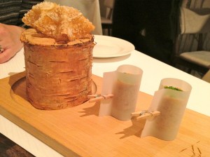 日本人ソムリエがいて、少し助かったが、量がとても多くてNは途中でギブアップ気味。メニューには8つ書かれていたので、8品かと思ったら8つのコンセプトから、何品か出てくるので、驚くべき量だった。以下、料理の概念の説明・・・・