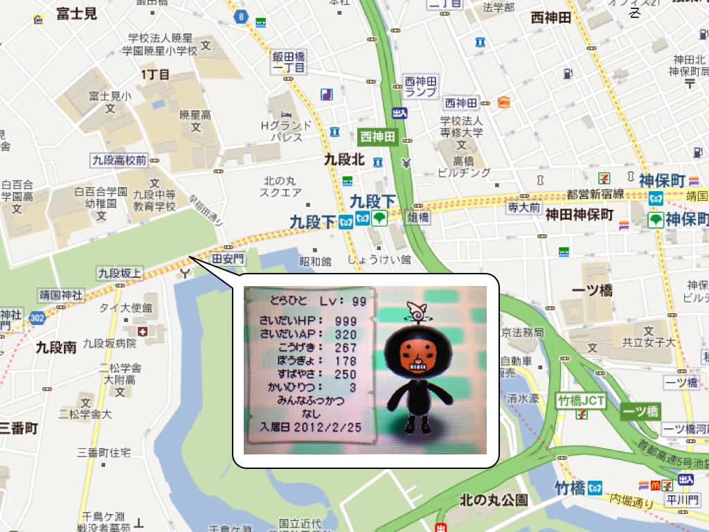 理解されにくい書き込み。3DSwareの『電波人間のRPG』において「みんなふっかつ」の能力をもった電波人間を発見。名前は「とらひと」。見つけたのは靖国神社の田安門近辺。