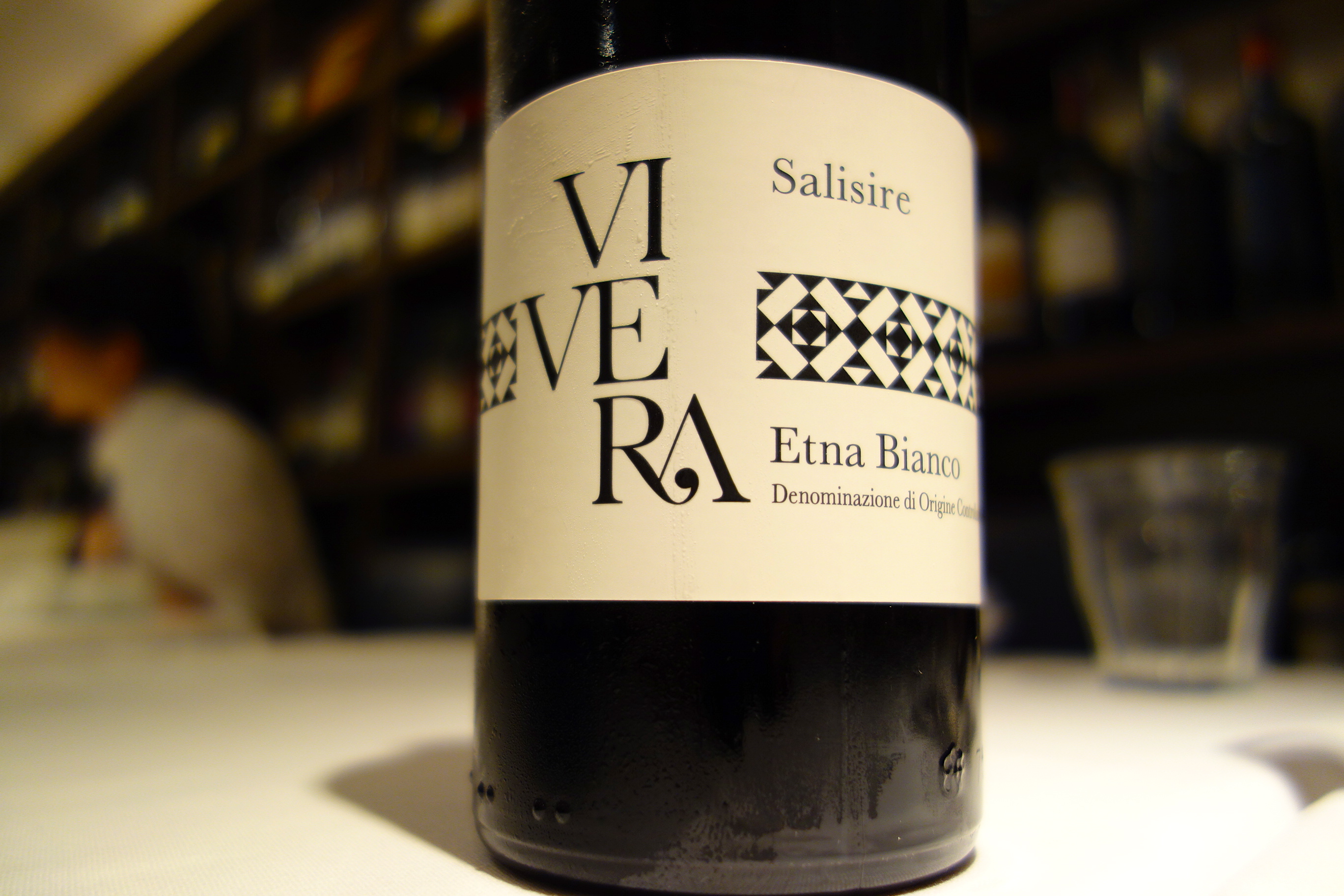シシリア島エトナ火山の麓で育つ葡萄でつくられた、辛口の白。レモンのような酸味とミネラル感。いいワインです。(だんだん、撮影テストではなくなってきている)。