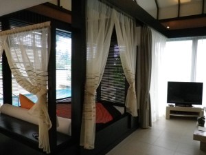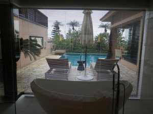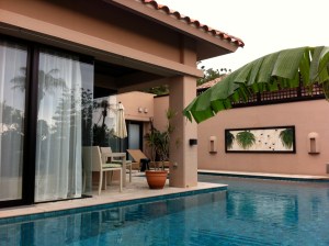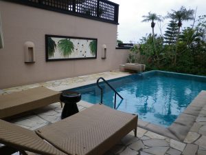 ゴルフコースに隣接している宮古島のリゾートホテル。プール付きのヴィラは広々として快適だった。今はまだ寒くて泳げないけど・・・