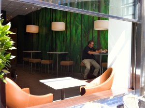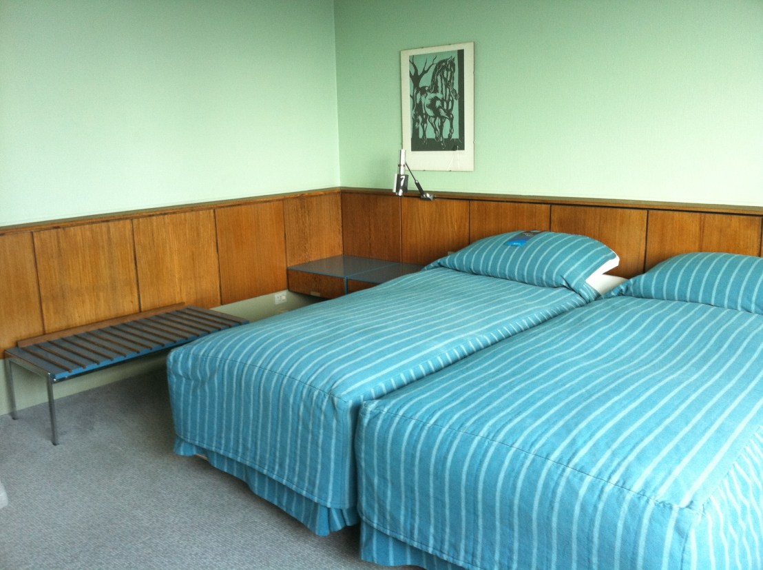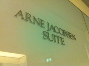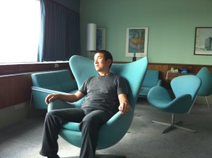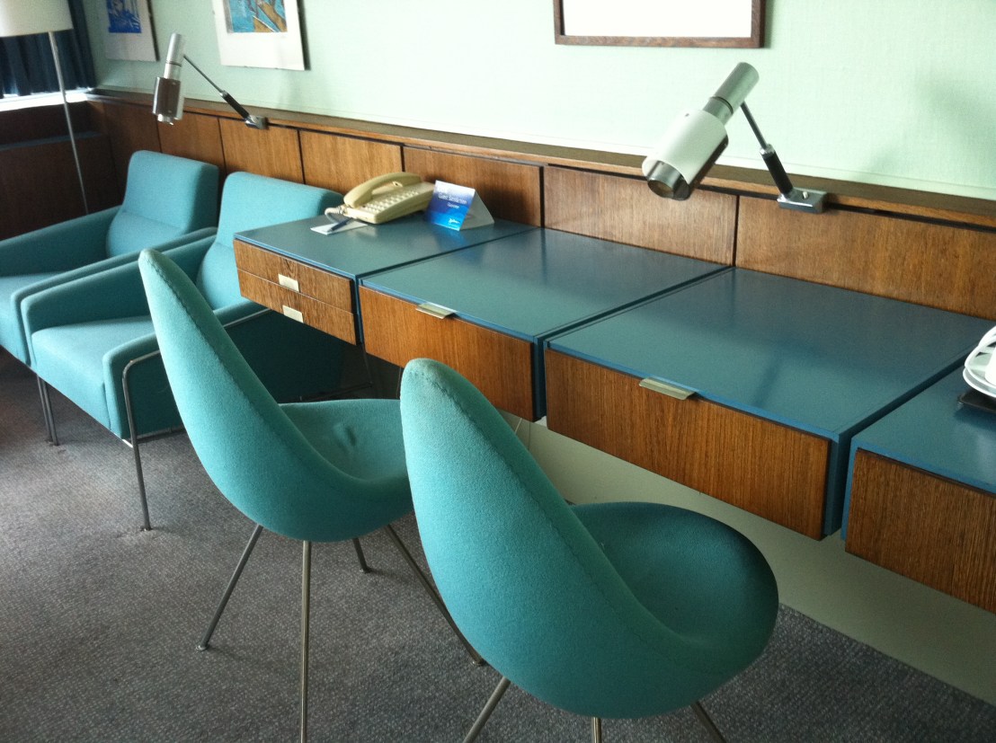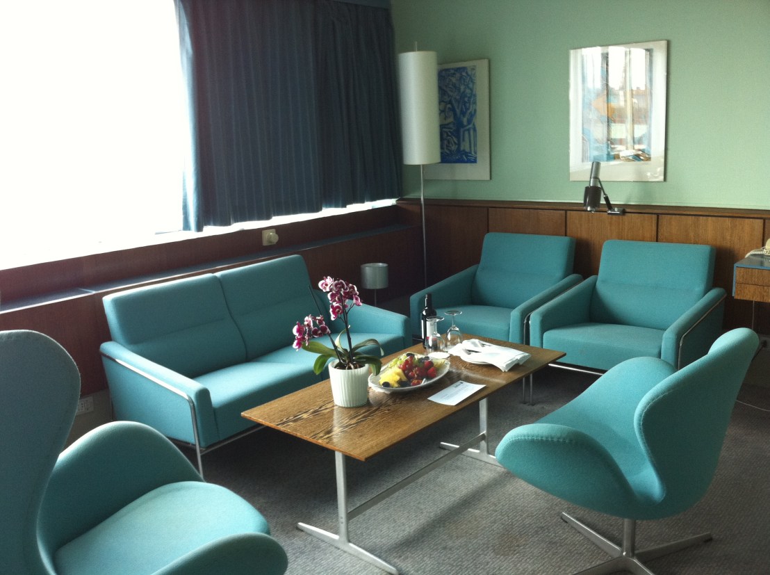 デンマークが生んだ世界的な建築家アルネ・ヤコブセン(Arne Emil Jacobsen)。彼はまた、多くの優れた椅子を設計した事でも知られる。旅の終わりのコペンハーゲンで宿泊したのは、50年前に彼が設計したラディソン・ブルー・ロイヤルホテル(旧SASロイアルホテル)。そして、606号室は、唯一ヤコブセンが設計した当時の内装を保持している。彼はこのホテルのドアノブ、引き出し、ステンレス製カトラリーなどのディテールに至るまで全てデザインしており、彼の細部までのこだわりと当時の雰囲気を楽しむことができる。エッグチェアに座り、満足そうなT。