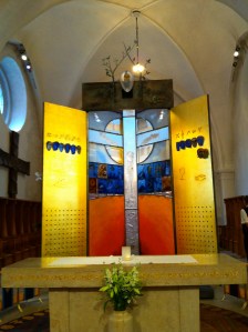 この教会は1958年から60年にかけて大改修が行われ、多くの彫刻家達が参画。祭壇などがガラス彫刻でつくられており、