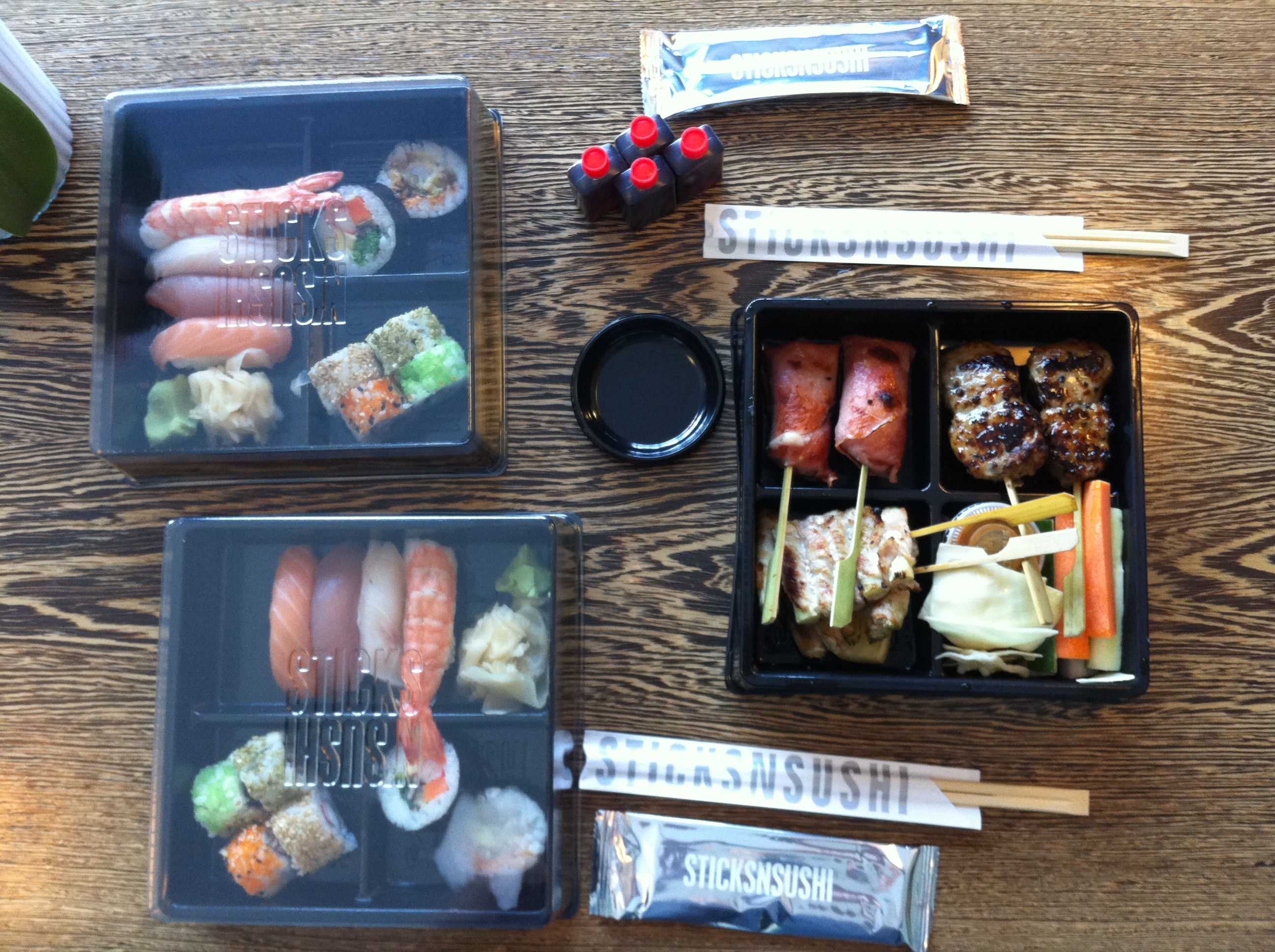コペンハーゲンの出前寿司。焼き鳥つき。つくねとアスパラベーコン巻きがウマい。寿司もなかなかいける。久しぶりの日本食に、ちょっと安心。ツボルグのビールとともに。