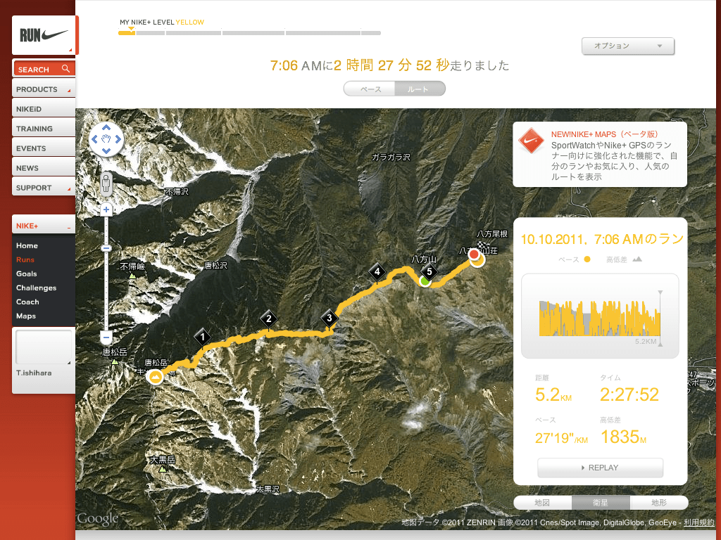 帰ってからGPSデータをアップロードすると、行程を細かく分析できる。上り4.5時間のコースを下り2.5時間で走破しているので、かなりのハイペースだったことが、よくわかる。ルートは正確にトレースされている。